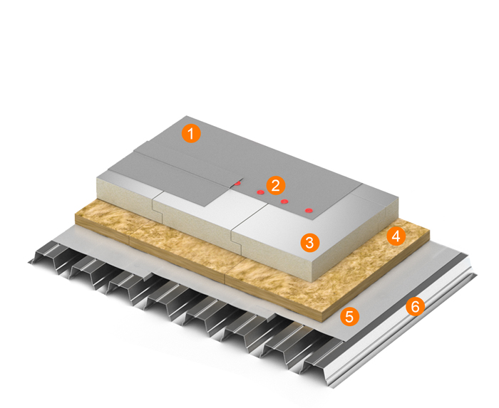Многослойная структура плоских кровель с «PIR Плитой»® гарантирует сохранение тепла или холода в помещении и устойчивость к пешеходным нагрузкам, длительность эксплуатации.